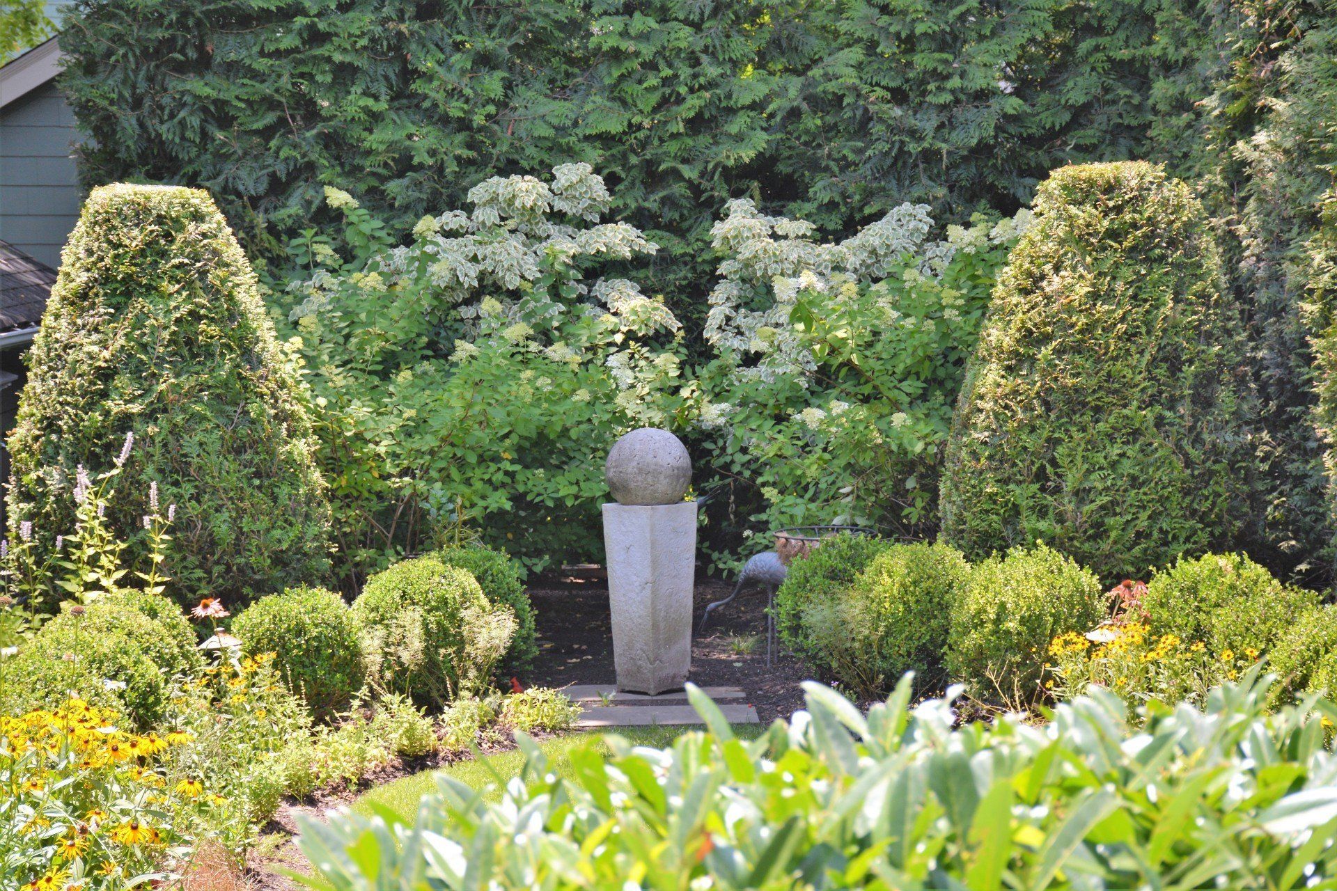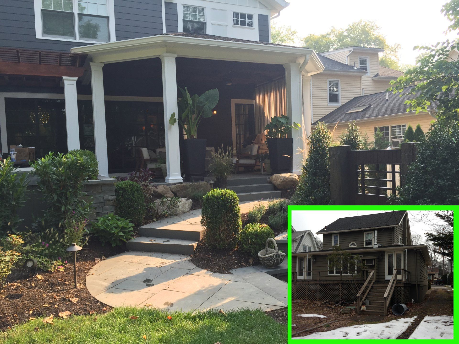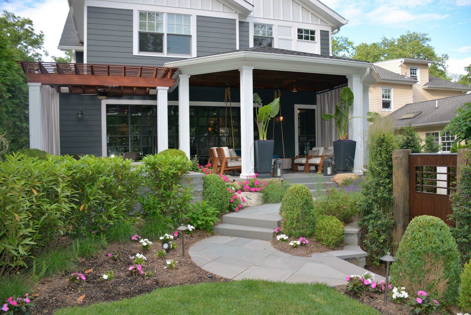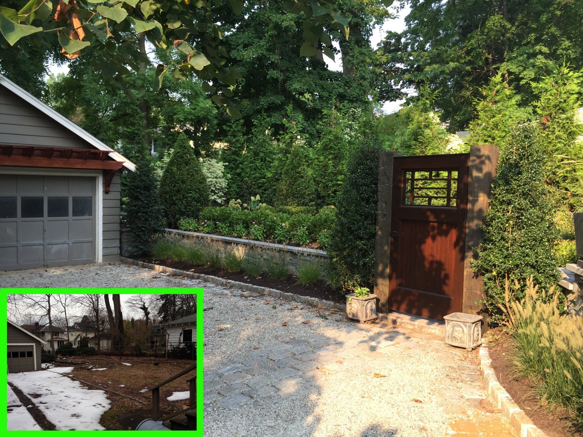 Project Scope of Work:Bluestone walkways and steps, custom carpentry, entrance gate, cobblestone and asphalt driveway, courtyard, gas firepit, outdoor seating areas, built in hot tub, luxurious plantings, privacy screening hedges, and low voltage lighting.