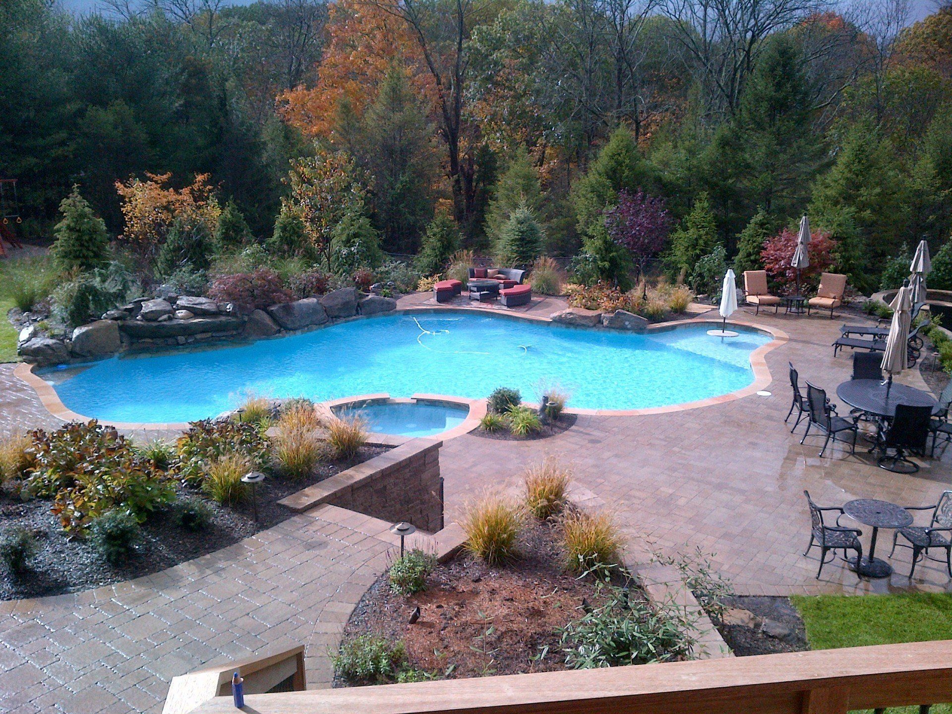 Project Scope of Work:Gunite pool and spa, paverblock retaining walls, paver patios, wood burning firepit, outdoor seating areas, custom pool cabana with outdoor kitchen/bar, sportcourt basketball court, colorful plantings, low voltage landscape lighting.