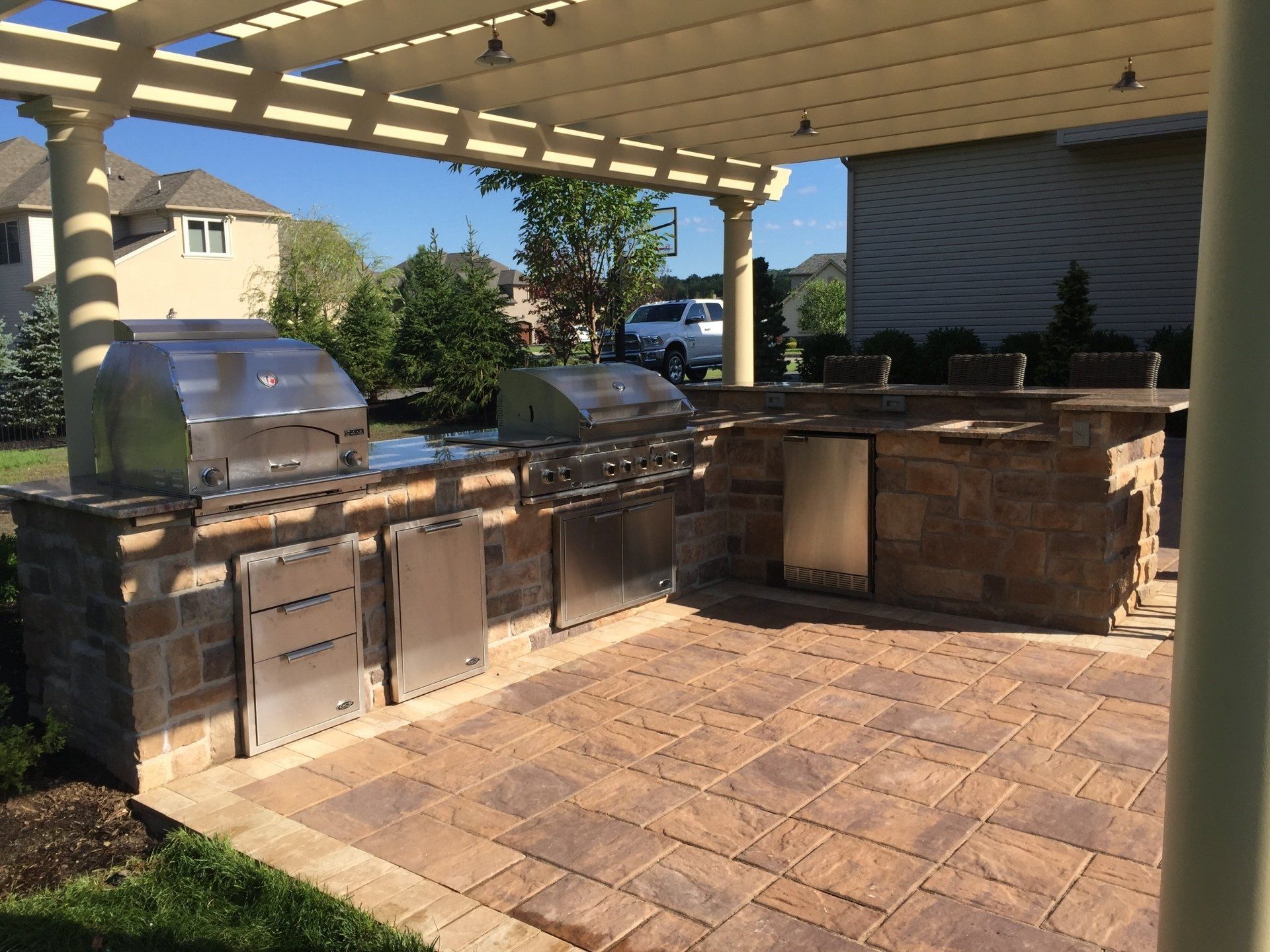 Project Scope of Work:Paver walkways and patios, water feature, pergola, outdoor kitchen and bar, wood burning firepit with seat wall, plantings, and low voltage landscape lighting.