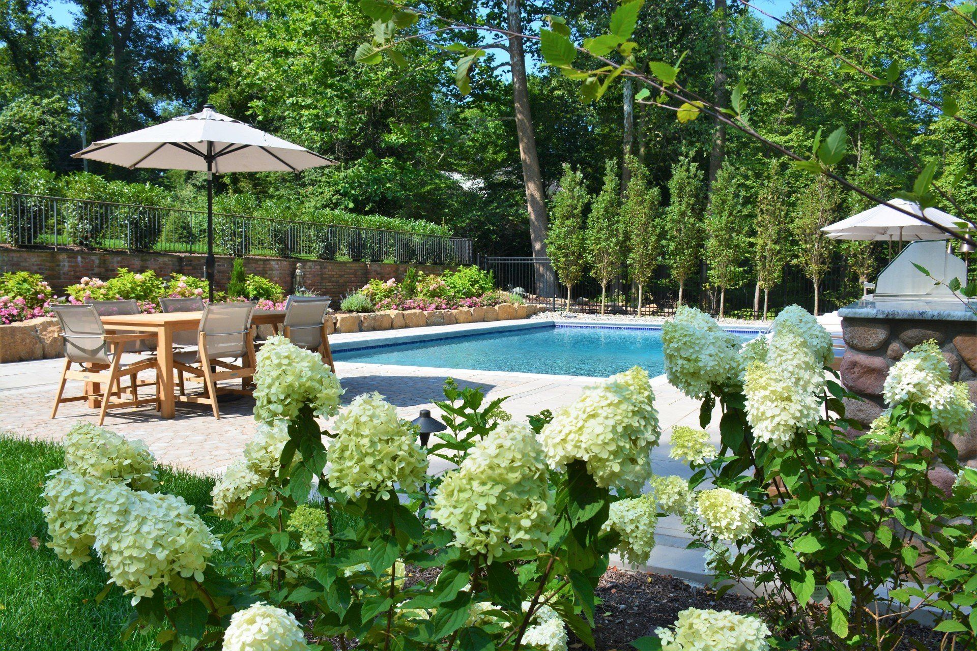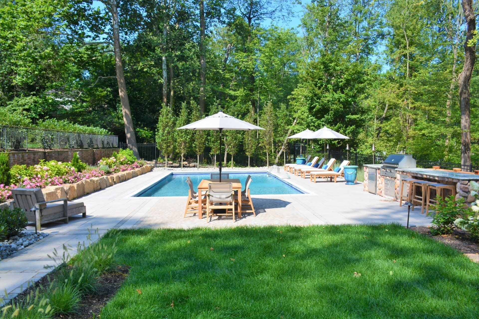 Project Scope of Work: Gunite pool, pavers, boulder retaining walls, bluestone steps, natural and cultured stone veneered walls, wood burning fireplace, outdoor kitchen and bar, custom lattice screen, water features, pea gravel seating areas, outdoor dining terrace, new utilities, fencing, sod lawn, planting urn, plantings, low voltage lighting