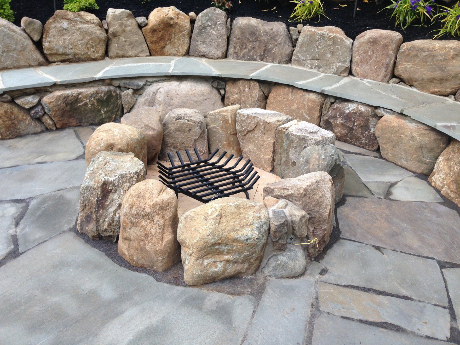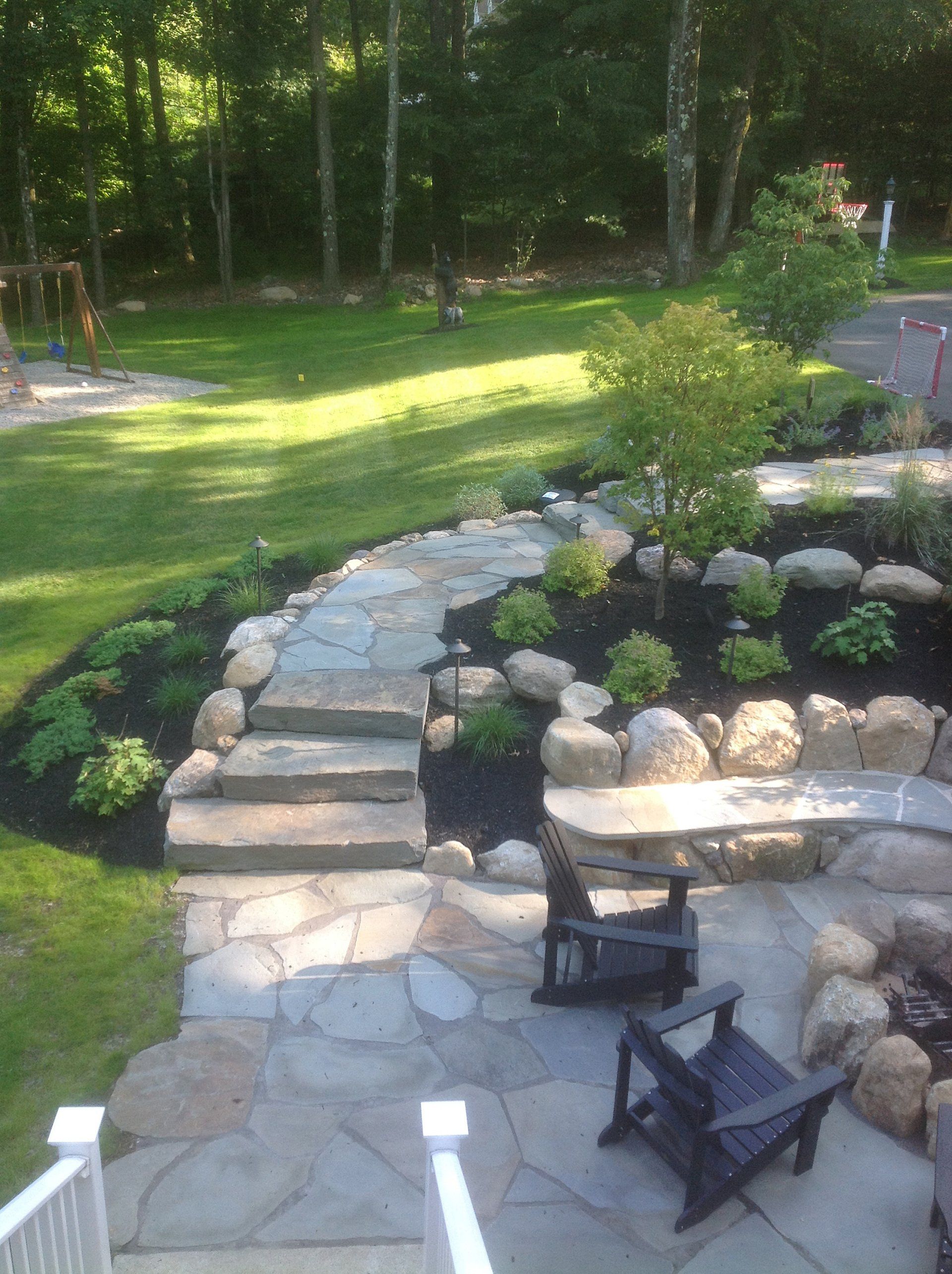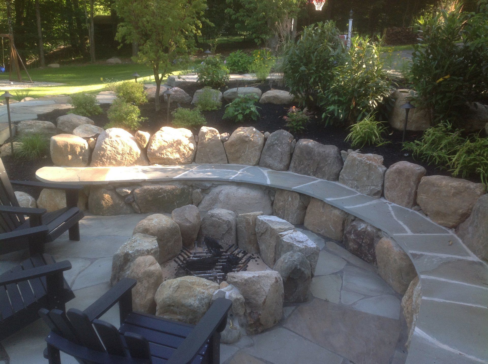 Project Scope of Work:Wood burning firepit, bluestone patio, natural boulders walls and steps, naturalistic plantings, and low voltage lighting.