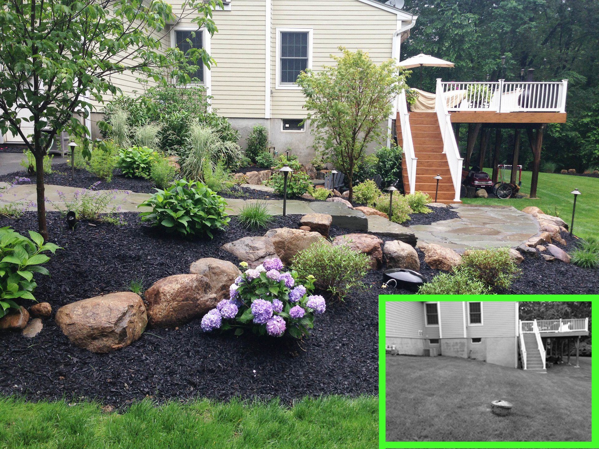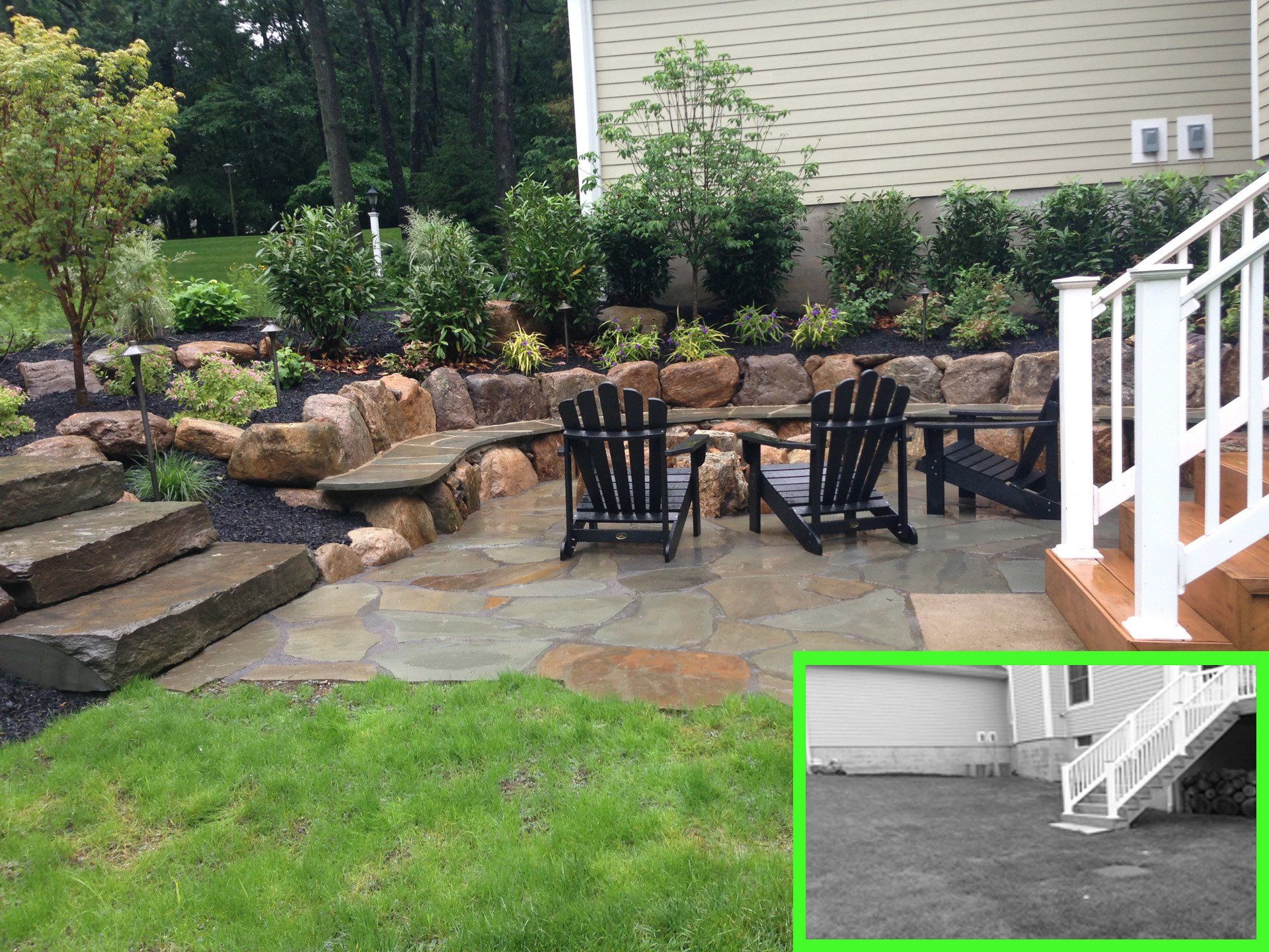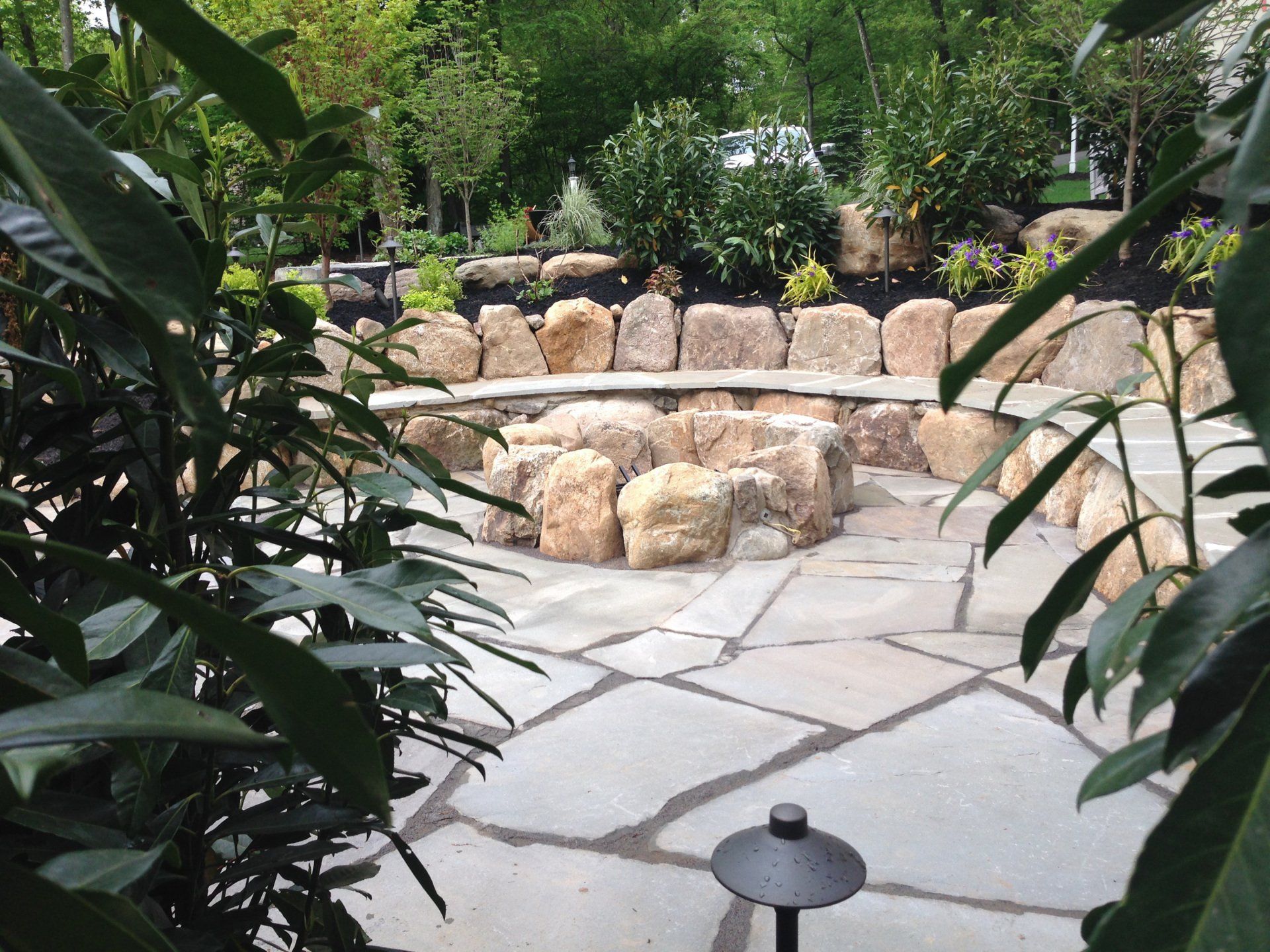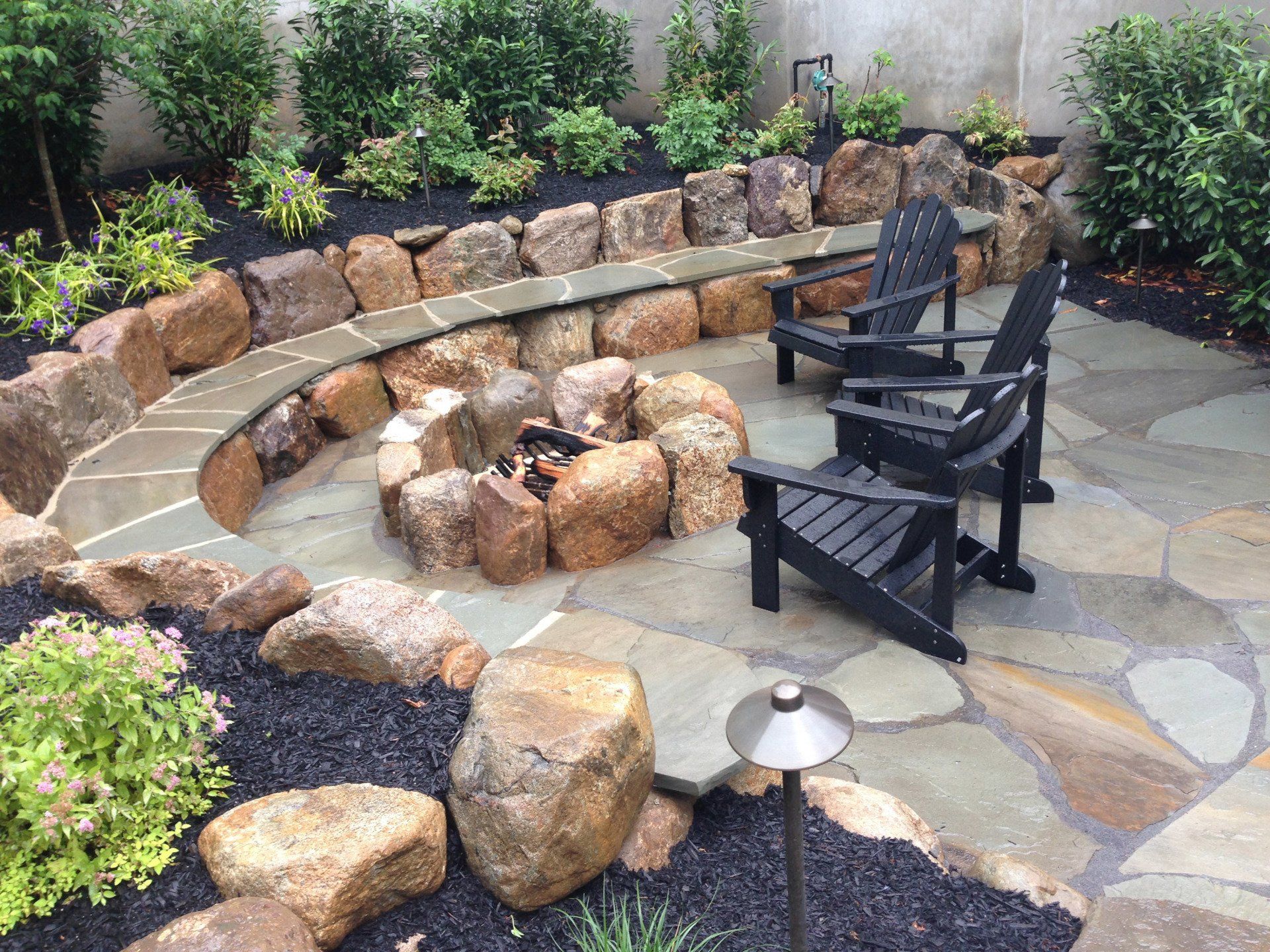 Project Scope of Work:Wood burning firepit, bluestone patio, natural boulders walls and steps, naturalistic plantings, and low voltage lighting.